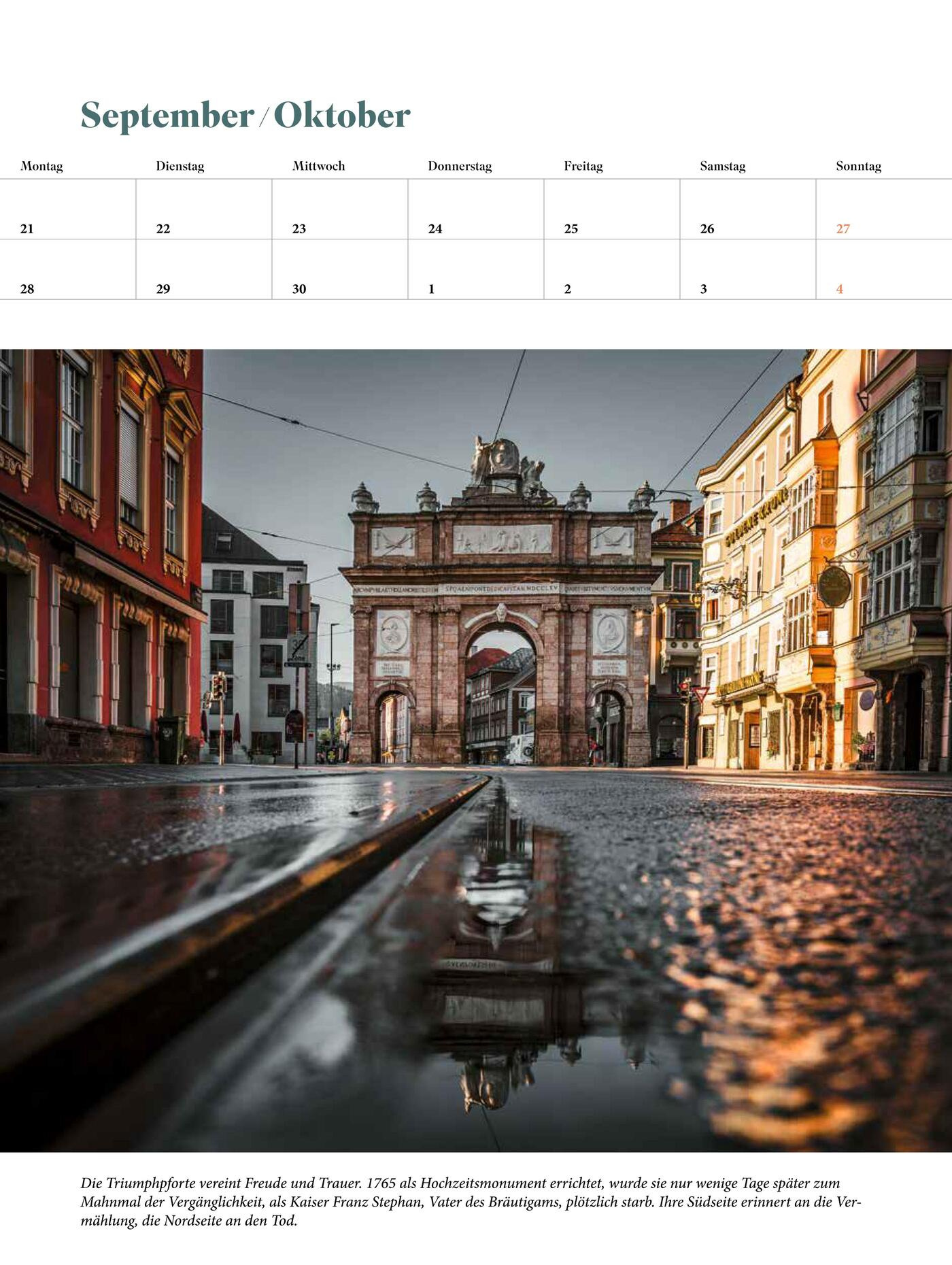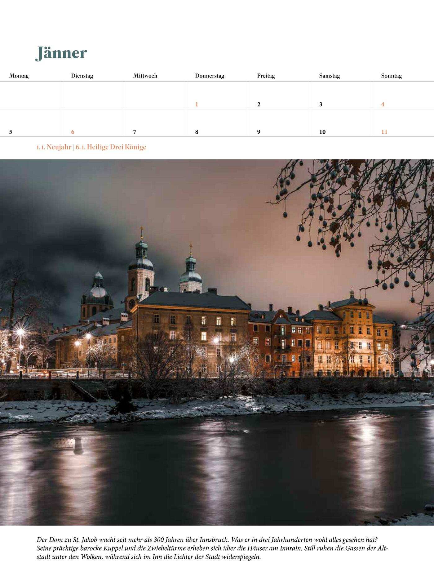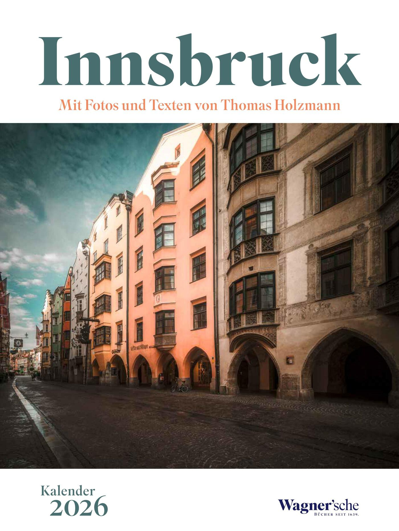 Innsbruck lebt vom Spannungsfeld zwischen Stadt und Natur, Geschichte und Gegenwart. Der neue Kalender von Thomas Holzmann zeigt die Tiroler Landeshauptstadt aus 27 besonderen Blickwinkeln: bekannte Wahrzeichen im Wechsel der Jahreszeiten, stille Innenhöfe und verborgene Ecken, moderne Architektur und barocke Pracht. So entsteht ein stimmungsvoller Streifzug durch das ganze Jahr, der Innsbruck in all seinen Facetten erlebbar macht – irgendwie vertraut und doch immer wieder überraschend.Mit 14-tägigem Kalendarium und Platz für persönliche Notizen.€ 19,95 | Lieferbar