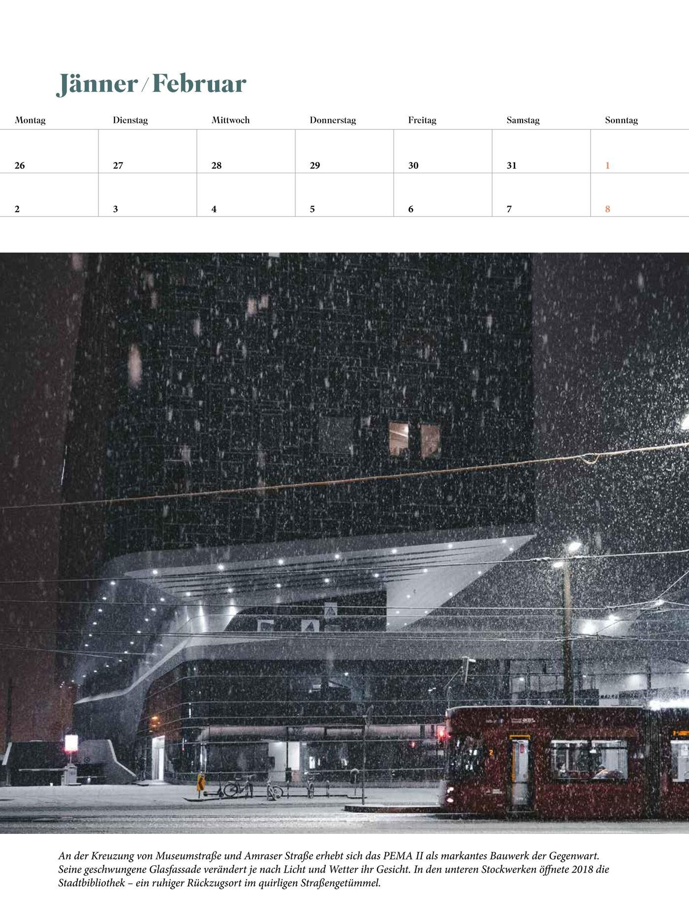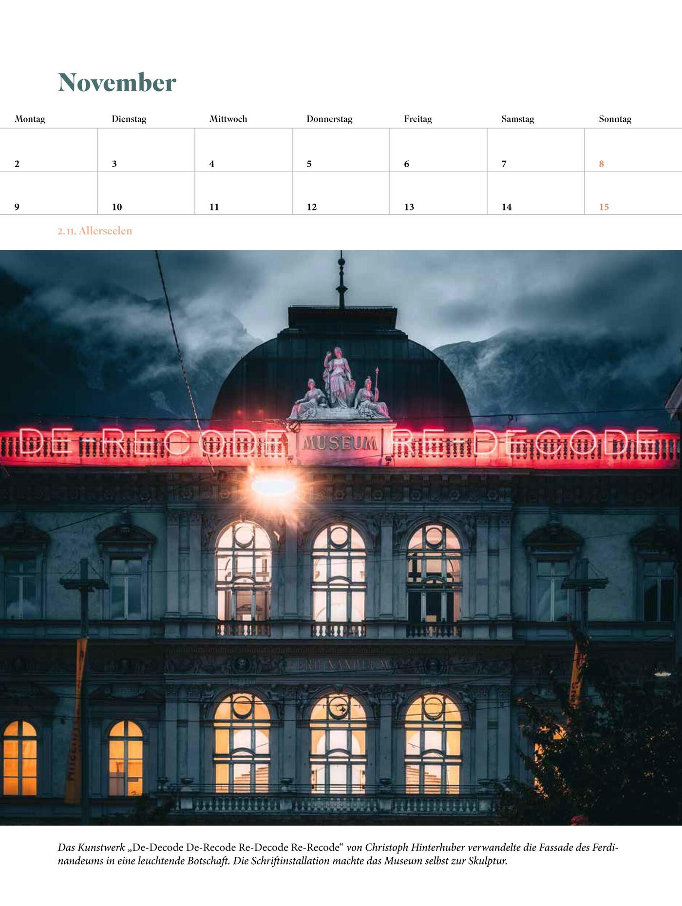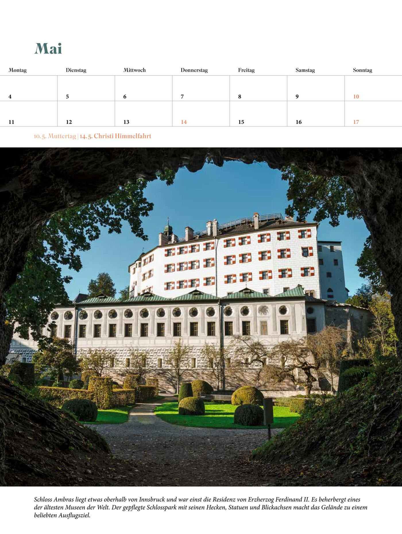 Innsbruck lebt vom Spannungsfeld zwischen Stadt und Natur, Geschichte und Gegenwart. Der neue Kalender von Thomas Holzmann zeigt die Tiroler Landeshauptstadt aus 27 besonderen Blickwinkeln: bekannte Wahrzeichen im Wechsel der Jahreszeiten, stille Innenhöfe und verborgene Ecken, moderne Architektur und barocke Pracht. So entsteht ein stimmungsvoller Streifzug durch das ganze Jahr, der Innsbruck in all seinen Facetten erlebbar macht – irgendwie vertraut und doch immer wieder überraschend.Mit 14-tägigem Kalendarium und Platz für persönliche Notizen.€ 19,95 | Lieferbar